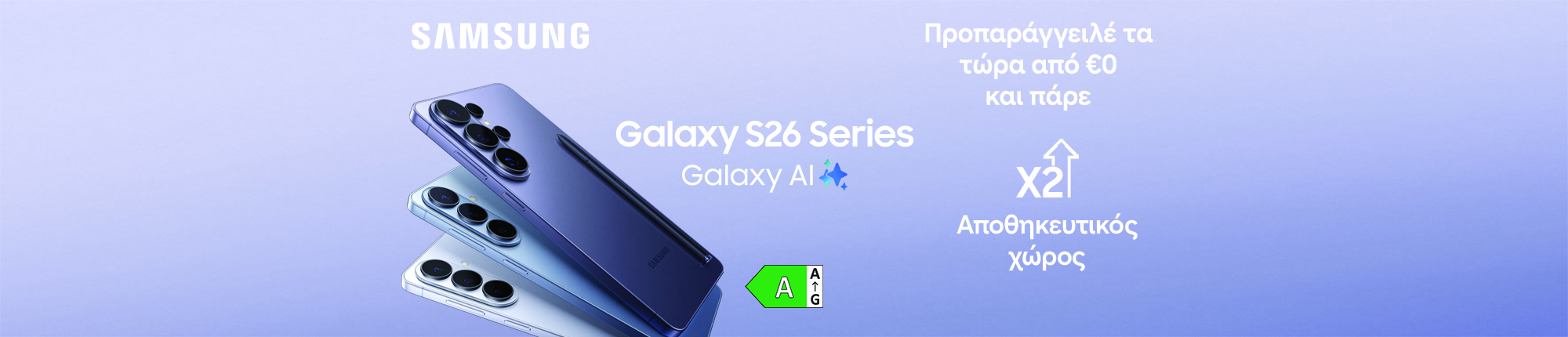 Ισχύει για προπαραγγελίες των Galaxy S26 Ultra 512GB, S26+ 512GB & S26 512GB έως 10.03.2026 και μέχρι εξαντλήσεως των αποθεμάτων.